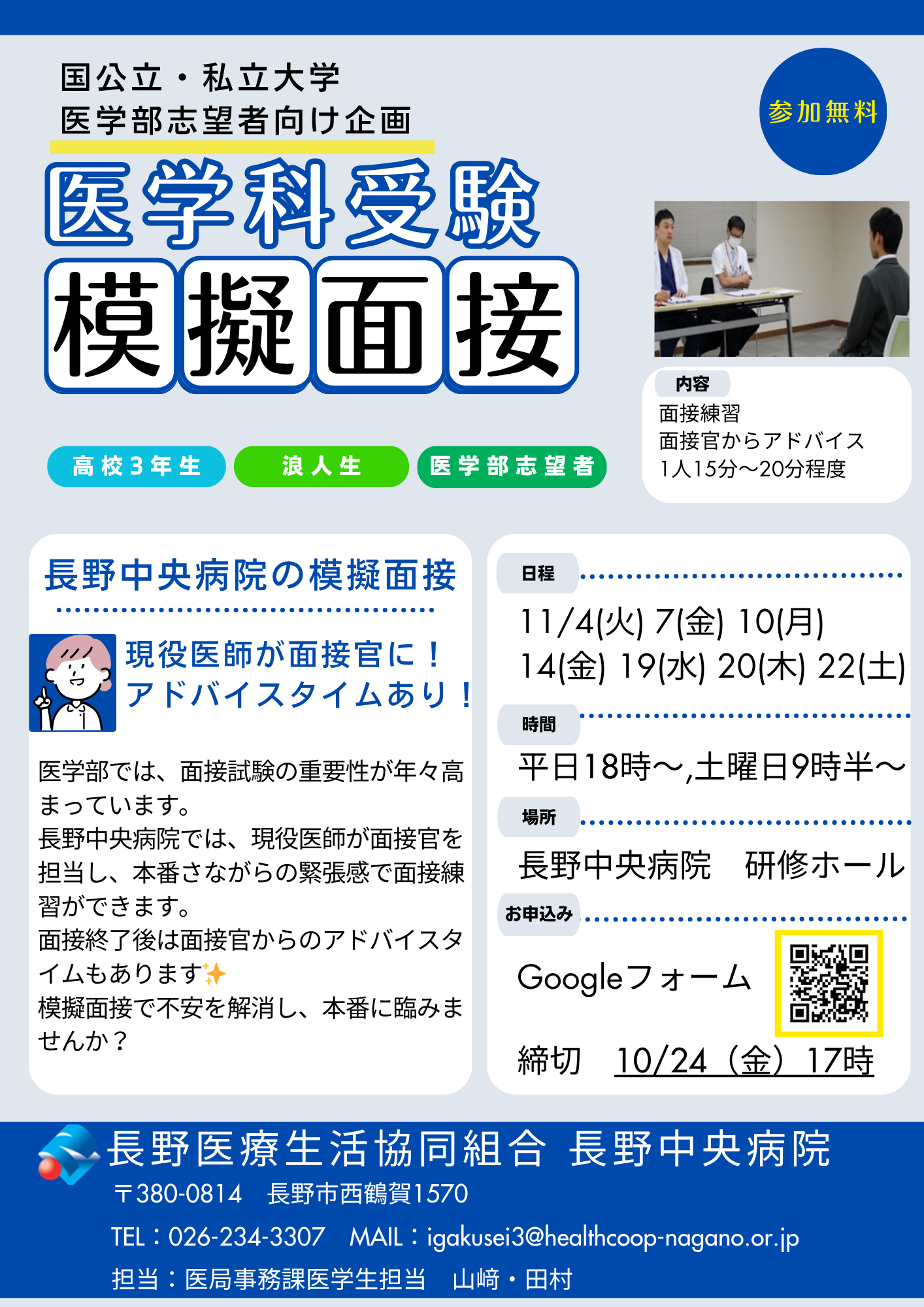 下記フォームまたは医学科模擬面接チラシ内QRコードよりお申込みください。