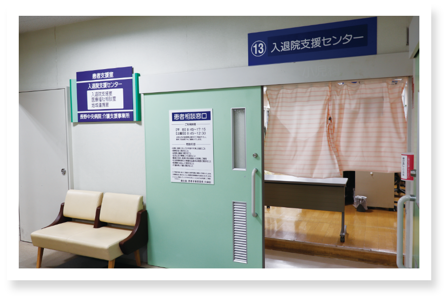 長野中央病院では、2025年10月より入退院支援センターを開設しました。入院前から患者さんの情報を把握し、病状や生活のようすを事前に確認して、どんな支援が必要かを早い段階で検討します。医師や看護師、相談員(医療ソーシャルワーカー)が協力しながら入院説明や治療準備を進め、同時に介護・福祉サービスや転院先の調整など退院後を見据えた支援にも早期から取り組みます。必要に応じて在宅医療や地域の医療機関とも連携し、患者さんとご家族が安心して自宅や地域に戻れるよう支えます。